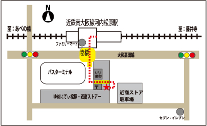※地下鉄御堂筋線天王寺駅又はJR天王寺駅下車、近鉄南大阪線あべの橋駅まで徒歩2分 準急に乗車 10分で河内松原駅に到着(急行に誤って乗車しないようにしてください)
